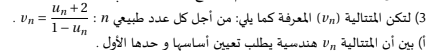 - لتكن المتتالية (vn) ( n∈N ),vn=un−2un−1.بين أن (vn) نتتالية هندسية